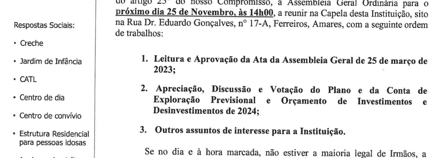 Edital da Assembleia Geral Ordinária da Santa Casa da Misericórdia de Amares, a realizar no próximo dia 25 de novembro pelas 14:00h na capela da Instituição.